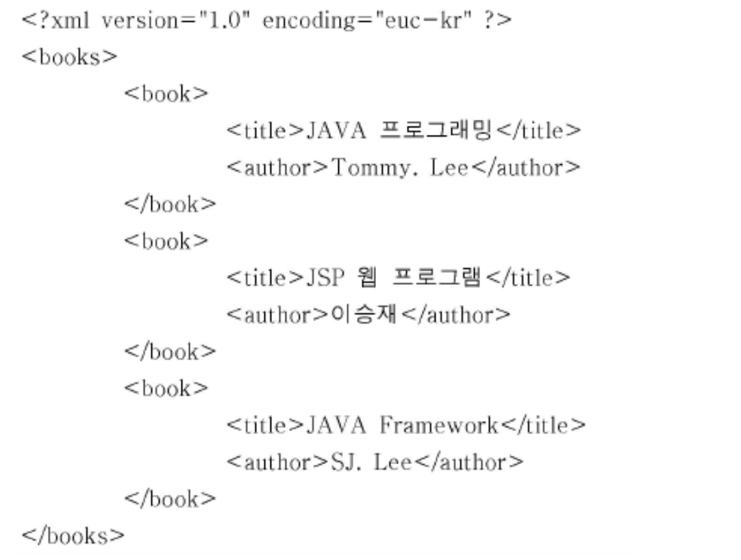 | <?xml version="1.0" encoding="UTF-8"?> <books> <book> <title>겨울왕국</title> <author>디즈니</author> </book> <book> <title>오늘은 화요일</title> <author>EBS</author> </book> <book> <title>이솝우화</title> <author>미드</author> </book> <book> <title>힐러리의 삶</title> <author>클린턴</author> </book> </books> |