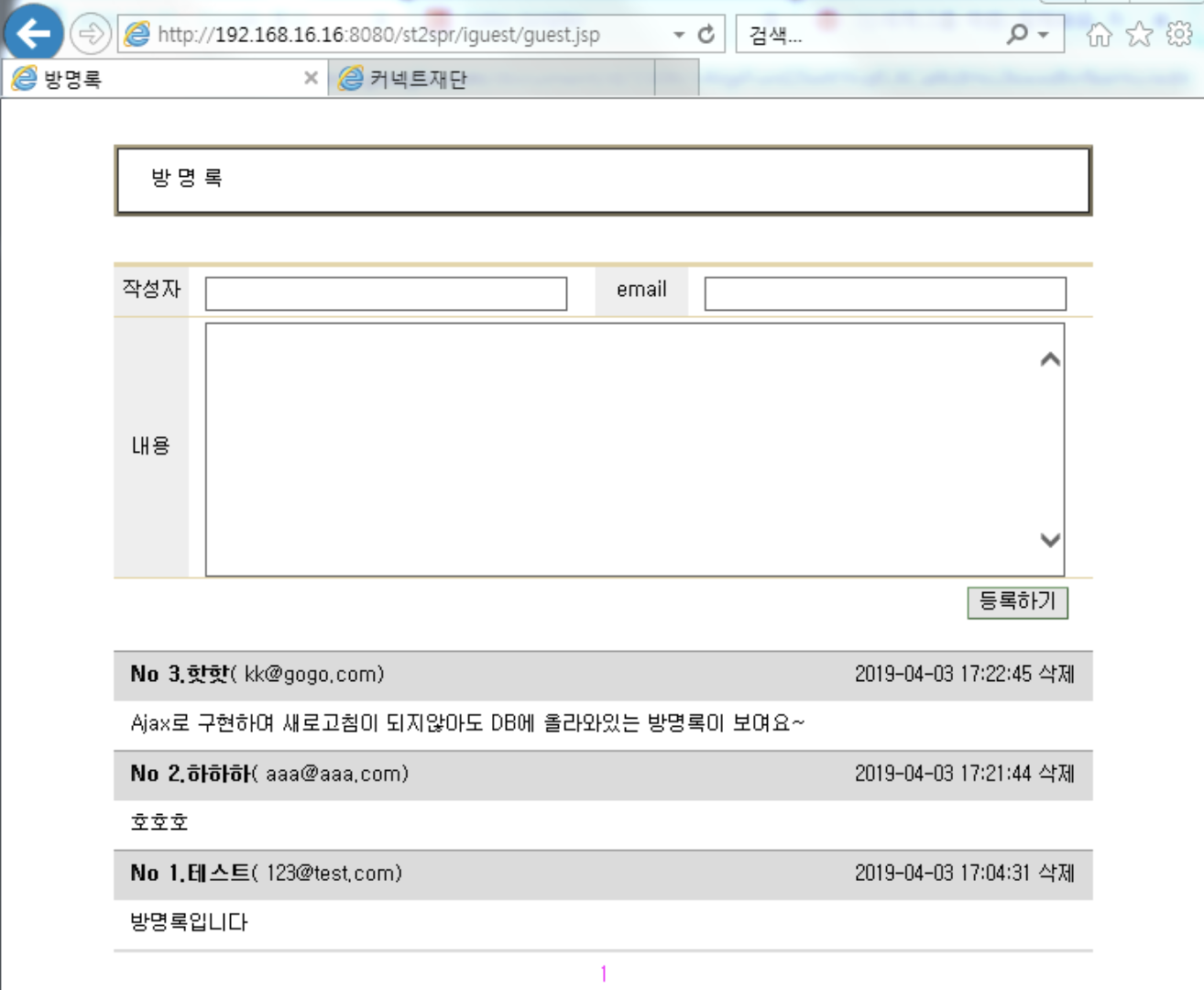 ▶ 페이지가 새로고침 되지않아도 비동기식을 활용하여 방명록이 업데이트되는 모습을 확인할 수 있다.