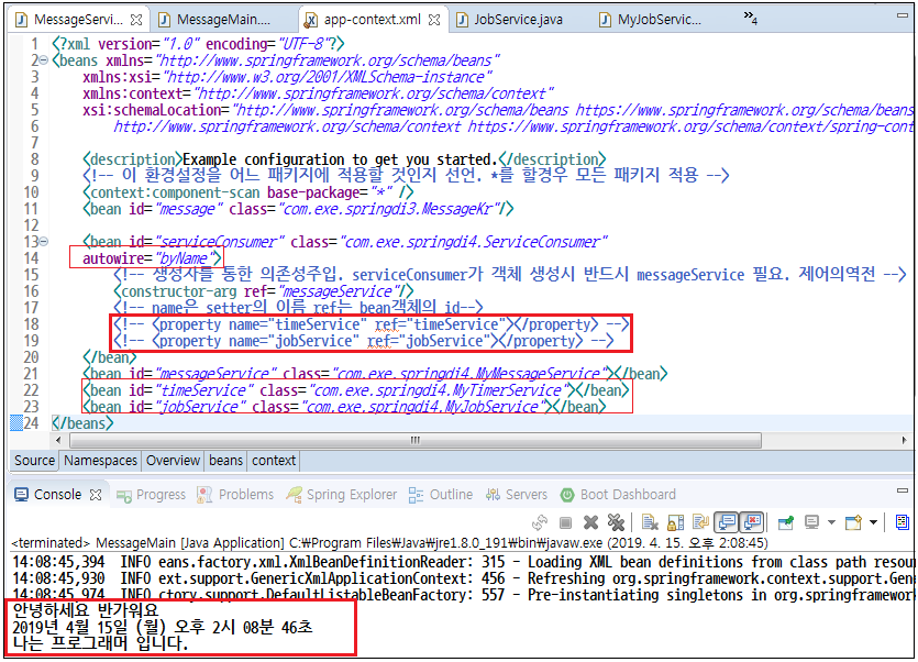 <!-- 이 환경설정을 어느 패키지에 적용할 것인지 선언. *를 할경우 모든 패키지 적용 --> <context:component-scan base-package="*" /> <bean id="message" class="com.exe.springdi3.MessageKr"/> <bean id="serviceConsumer" class="com.exe.springdi4.ServiceConsumer"autowire="byName"> 생성자를 통한 의존성주입. serviceConsumer가 객체 생성시 반드시 messageService 필요. 제어의역전 <constructor-arg ref="messageService"/> name은 setter의 이름 ref는 bean객체의 id <property name="timeService" ref="timeService"></property> <property name="jobService" ref="jobService"></property> </bean> <bean id="messageService" class="com.exe.springdi4.MyMessageService"></bean> <bean id="timeService" class="com.exe.springdi4.MyTimerService"></bean> <bean id="jobService" class="com.exe.springdi4.MyJobService"></bean> |