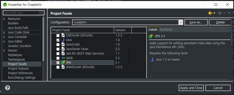 2. 프로젝트 설정 변경 properties > project facets > JPA 체크