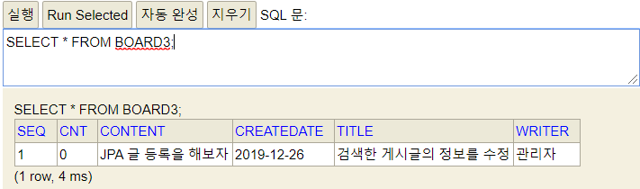 >>> Board [seq=2, title=JPA 제목, writer=관리자, content=JPA 글 등록을 해보자, createDate=2019-12-26, cnt=0]