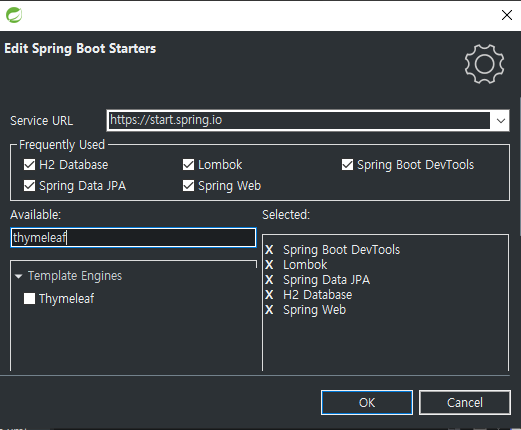 프로젝트 생성시 사용 모듈 추가: Web, Lombok JPA, H2, DevTool