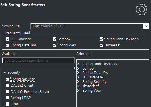 프로젝트 생성 사용 모듈 : DevTools, H2, JPA, Lombok, Thymeleaf, Web