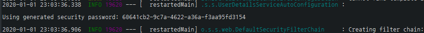 시큐리티 스타터 추가하면 시큐리티 관련 의존성이 추가되고 관련된 자동 설정들도 동작한다. 애플리케이션을 재시작하면 메모리에 인증에 필요한 사용자가 자동으로 등록.