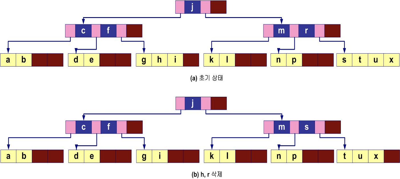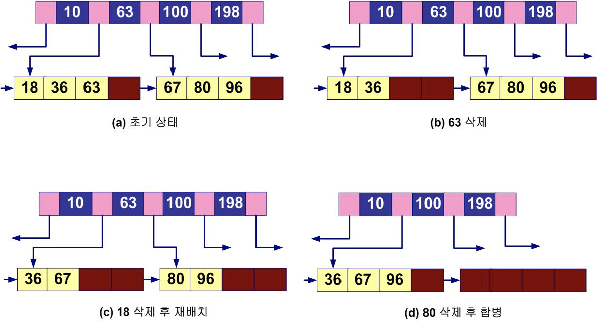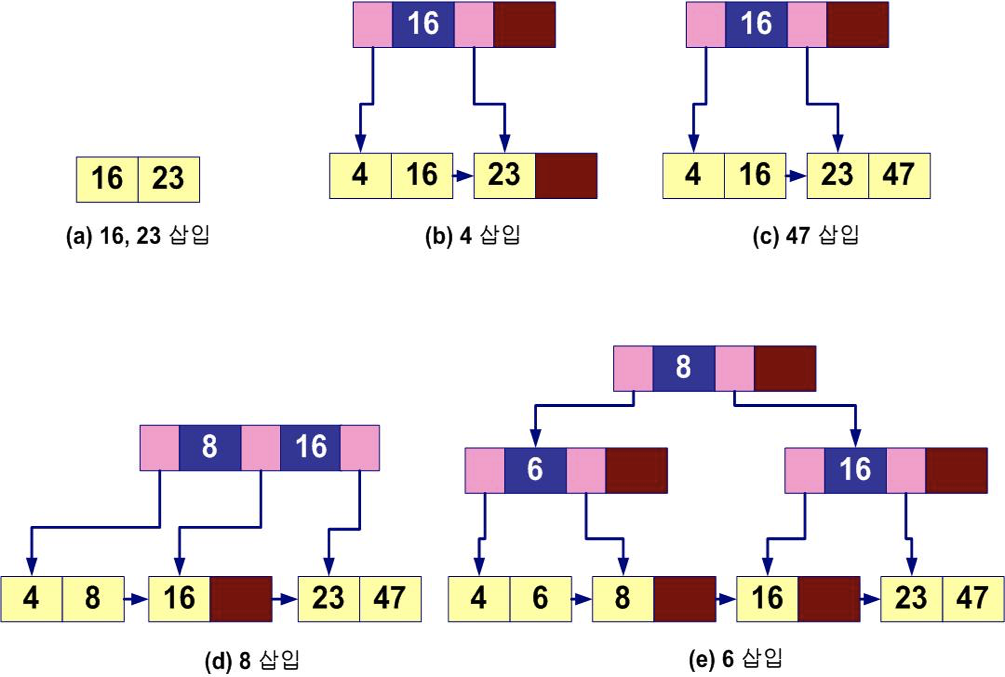 - 노드의 삽입과 삭제 시 트리의 균형을 유지하기 위해 복잡한 연산이 필요하다(재분배, 합병)