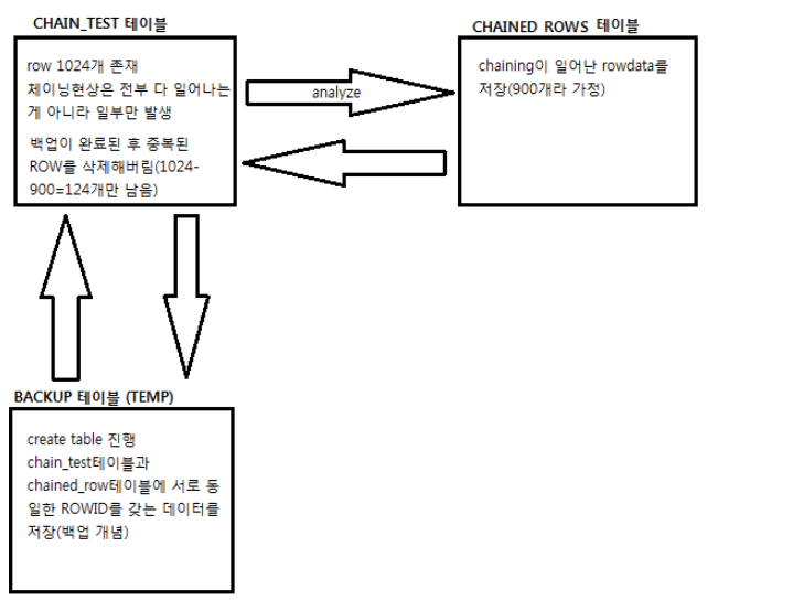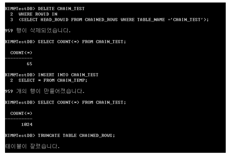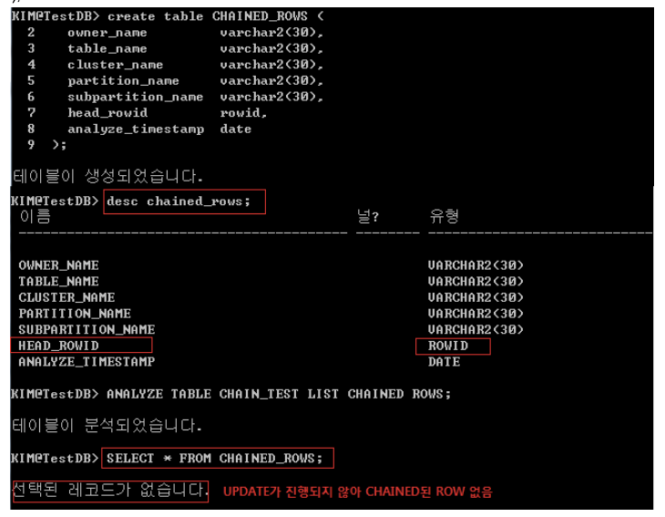 ③ CHAIN_TEST 테이블을 ANALYZE해서 CHAINED_ROWS 테이블로 작성