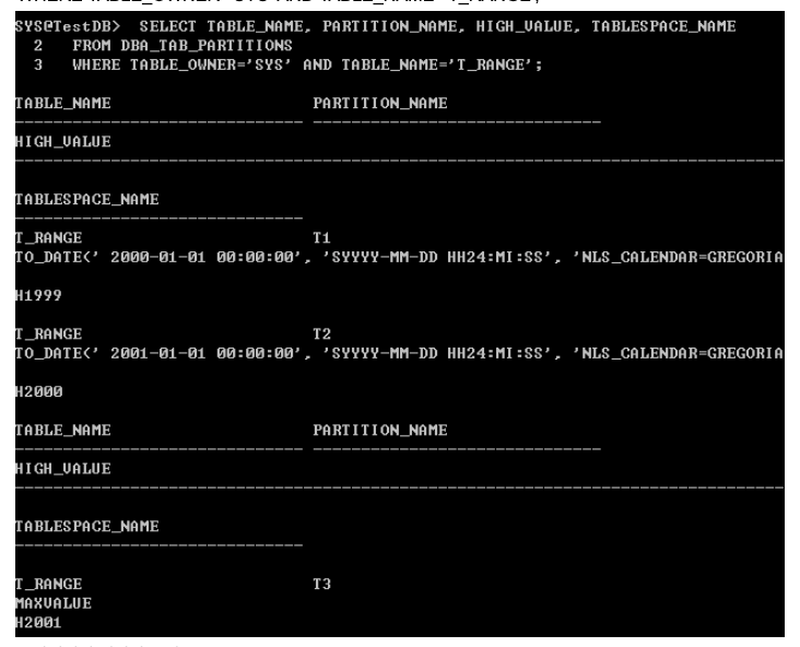 SELECT TABLE_NAME, PARTITION_NAME, HIGH_VALUE, TABLESPACE_NAME