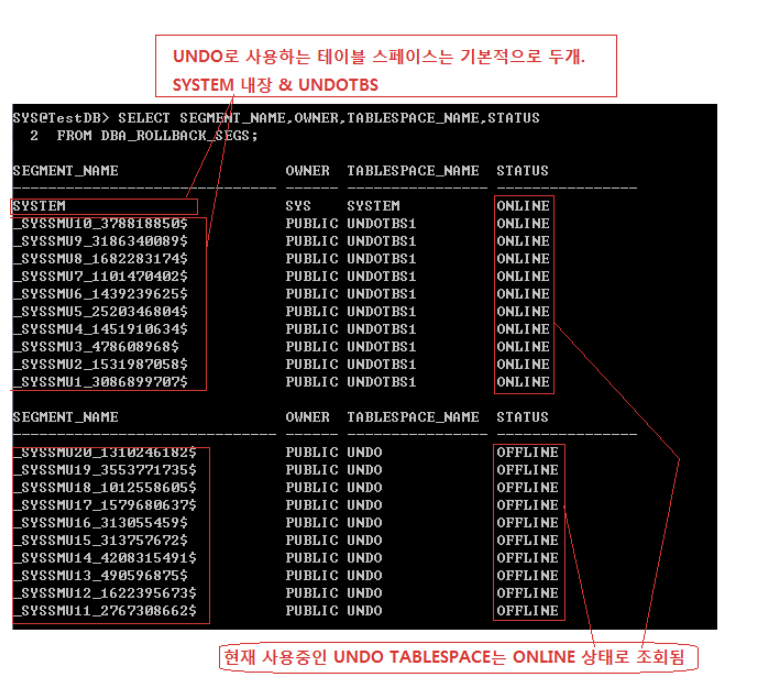 SELECT SEGMENT_NAME,OWNER,TABLESPACE_NAME,STATUS FROM DBA_ROLLBACK_SEGS;