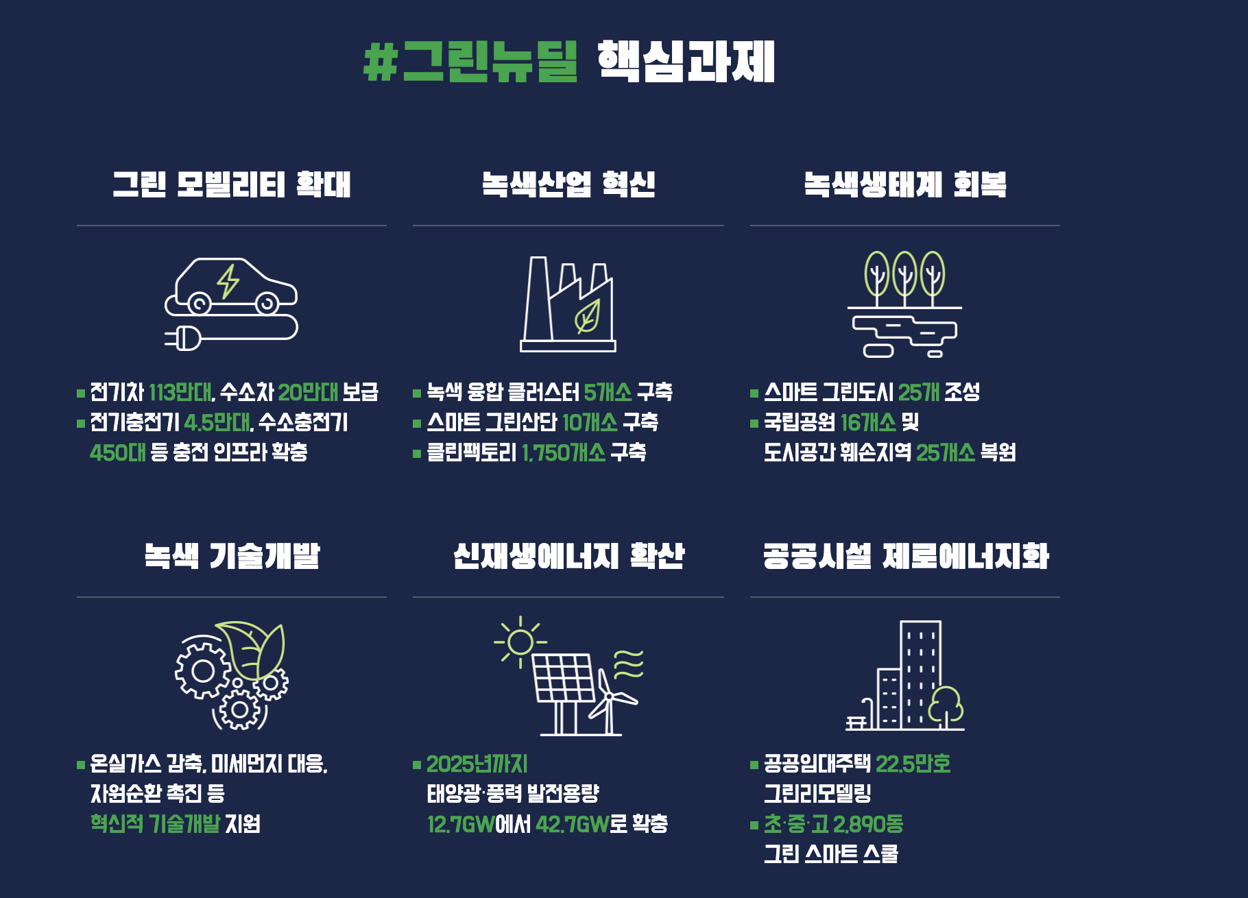 그린 뉴딜은 환경과 사람이 중심이 되는 지속 가능한 발전을 뜻하는 말로 현재 화석 에너지 중심의 에너지 정책을 신재생에너지로 전환하는 것을 말합니다. 코로나19로 인해 경제 상황이 위축되면서 많은 이들이 일자리를 잃고 있다. 저탄소 경제구조로 전환하며 고용과 투자를 늘리는 것이 필요한 상황이다. 이에 미국, 유럽 등에서 실시한 그린 뉴딜에 주목하게 되었고 신재생에너지의 비중을 높이면서 기후변화에 대응하는 동시에 고용까지 촉진하고자 하는 목표를 가지고 있다.