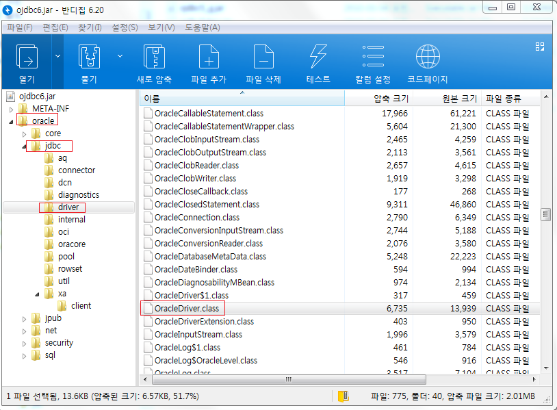 - OJDBC6 파일을 알집으로 열면 하기와 같이 보인다. 오픈API가 아니기 때문에 소스가 보이지 않고 CLASS가 존재하는 것만 알수있다.