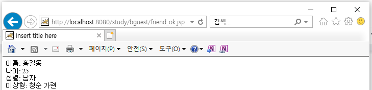 <%@ page contentType="text/html; charset=UTF-8"%> <% request.setCharacterEncoding("UTF-8"); %> <jsp:useBean id="vo" class="com.friend.FriendVO" scope="page"></jsp:useBean> <jsp:setProperty property="*" name="vo"/> <% String str = ""; if(vo.getType()!=null){ for(String temp: vo.getType()) str += temp +" "; } %> <!DOCTYPE html PUBLIC "-//W3C//DTD HTML 4.01 Transitional//EN" "http://www.w3.org/TR/html4/loose.dtd"> <html> <head> <meta http-equiv="Content-Type" content="text/html; charset=UTF-8"> <title>Insert title here</title> </head> <body> 이름: <%=vo.getName() %><br> 나이: <%=vo.getAge() %><br> 성별: <%=vo.getGender() %><br> 이상형: <%=str %><br> </body> </html> |